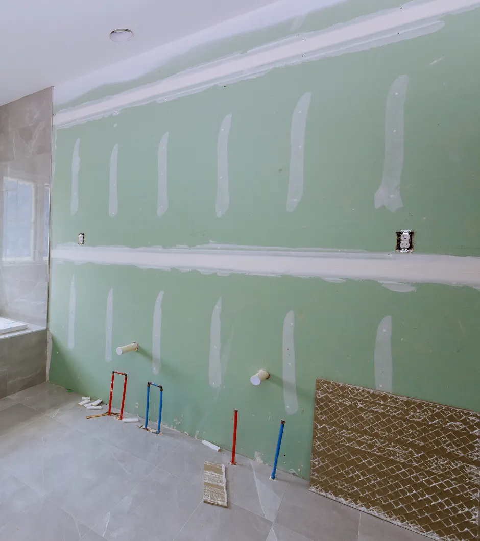 Bathroom addition under construction with new framing, insulation, plumbing rough-in, and waterproofing panels installed for a Los Angeles home